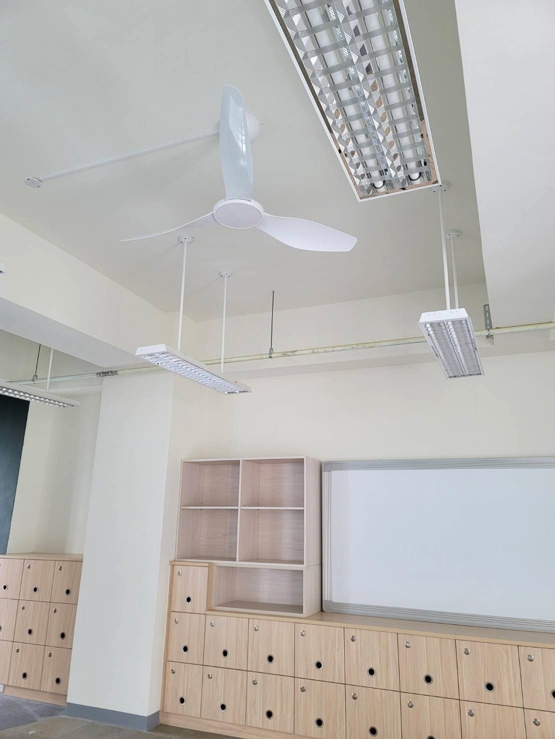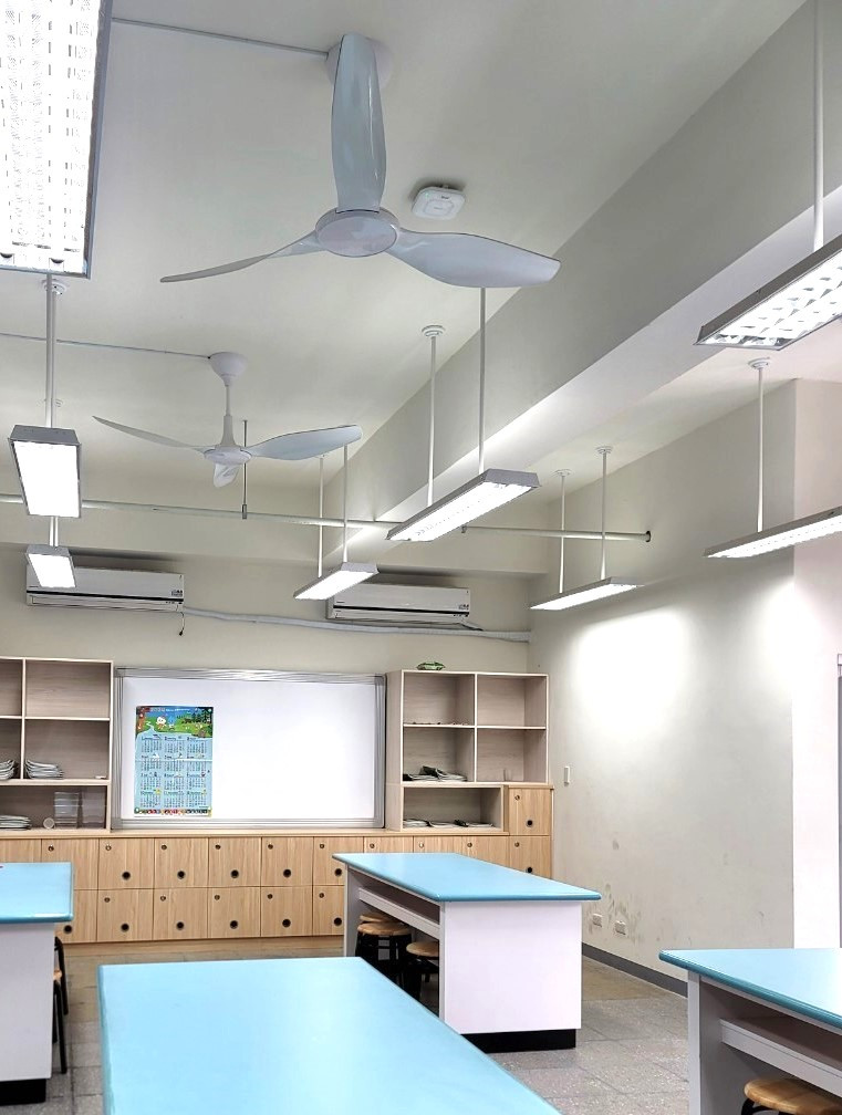 以往學校都採用一般AC旋轉風扇,不僅需設置支數多且轉動聲大,以致影響孩子們學習品質。