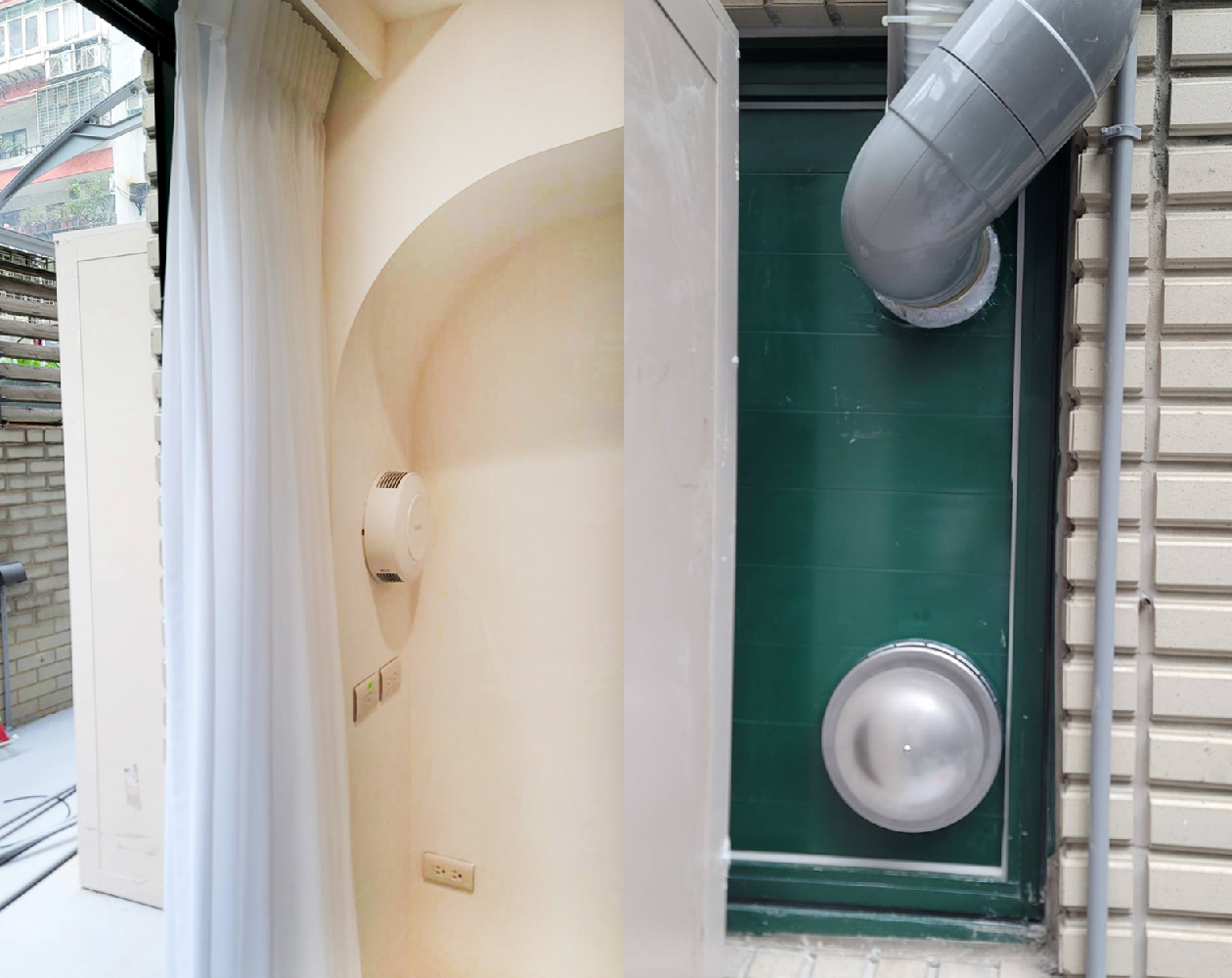 為了進一步配合墻面造形有效抗阻風雨,我們特別加裝了 UFO幽浮排氣罩,不僅減少噪音的產生,增强外部的美觀,同時還優化了進風的效率。
