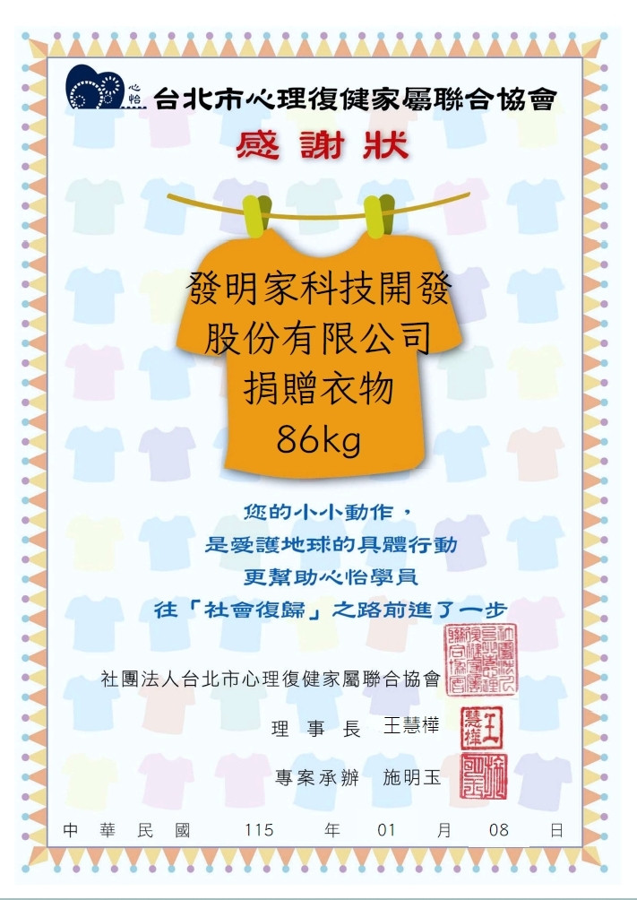 今日發明家集團將全體同仁集結的 86 公斤愛心衣物,正式捐贈給「台北市心理復健家屬聯合協會(心怡協會)」,這 86 公斤的重量,代表的是**「綠色循環經濟」**的實踐。透過衣物的二次流通與再利用,我們能有效減少紡織廢棄物對地球的負擔,將資源的生命週期延長,這正是發明家集團對於永續環境最真實的響應。
