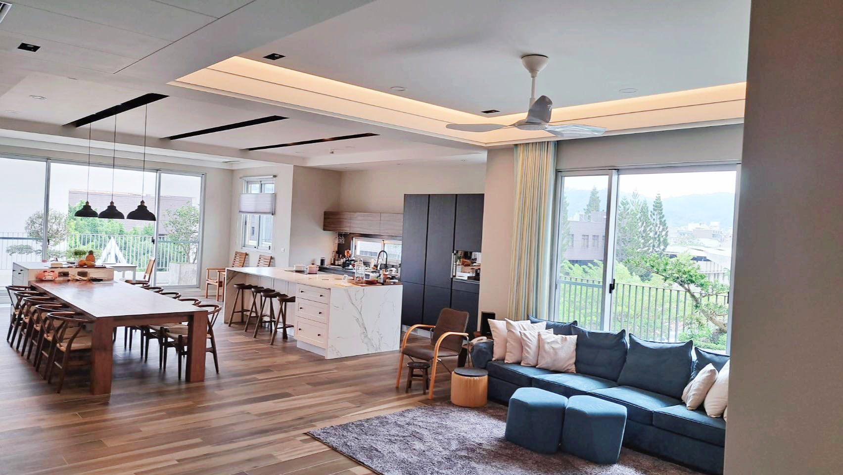 而當代經典吊扇放置於廚具展示區- 開放式廚房旁的休憩區,空間設計寬敞舒適,