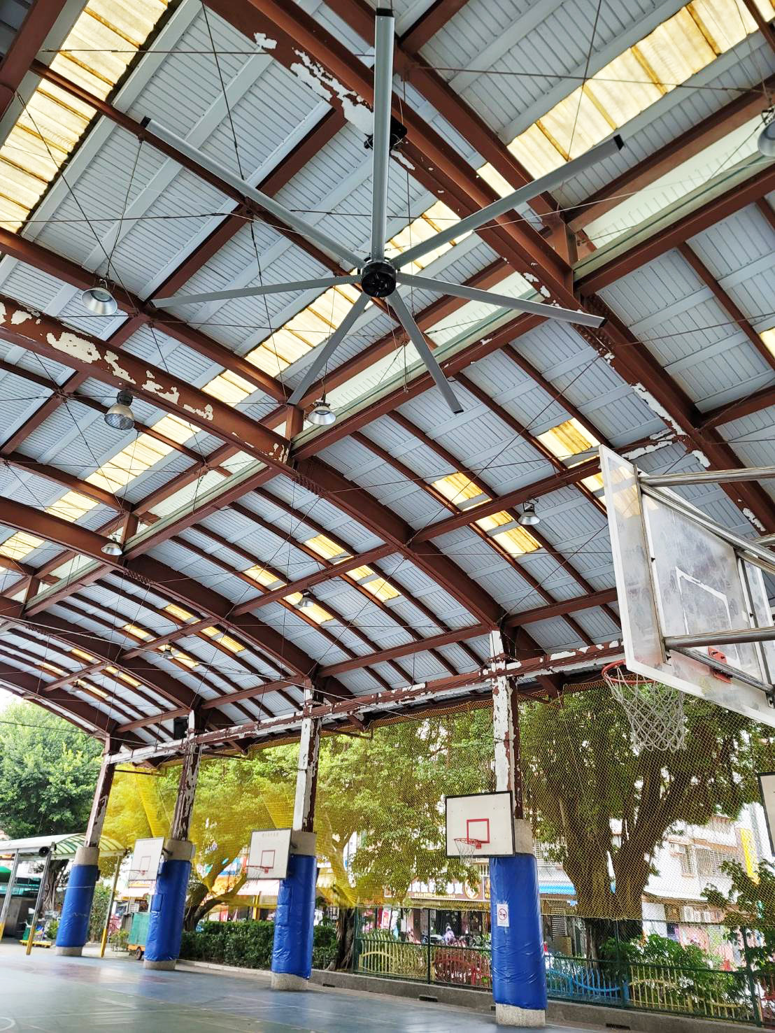 在112年度的校園設施改善計畫中,我們安裝了Powerful Series 10_5米 節能工業吊扇位於樂活館籃球場上空!