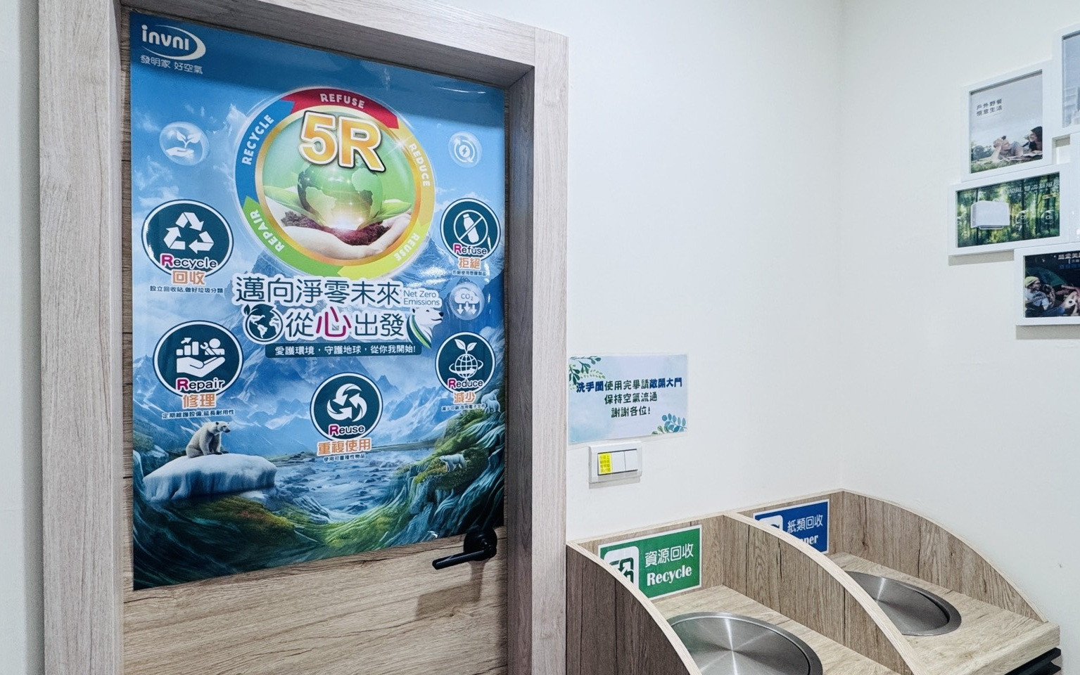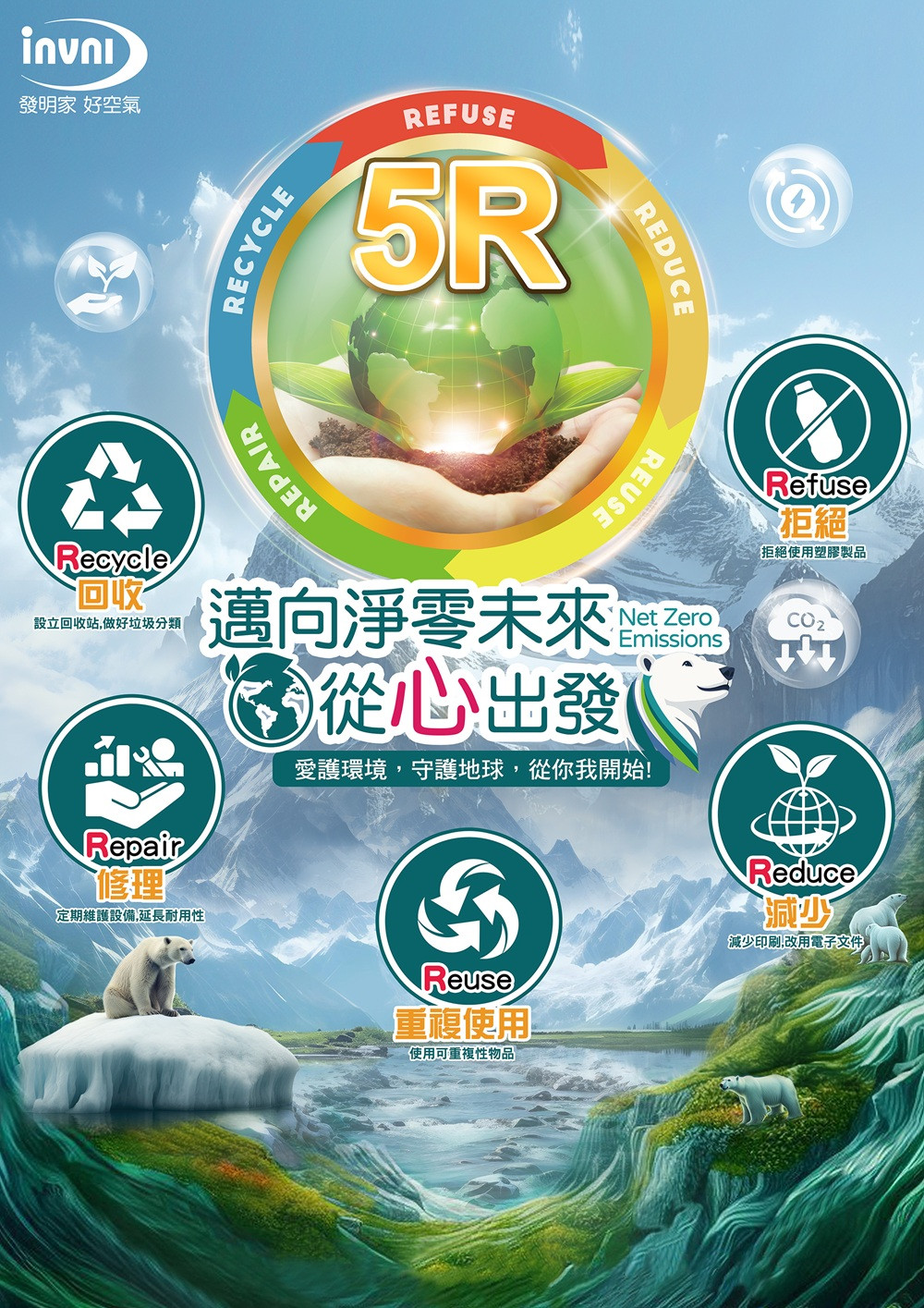 環境保護不只是口號,而是我們日常的一部分。為了打造更永續的未來,發明家集團積極推動 5R 環保行動,並在各大辦公室張貼 5R 海報,提醒同仁從自身做起,共同守護地球。